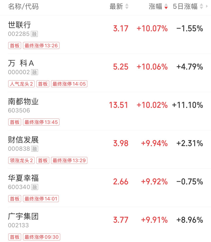 受此带动,A股地产板块也全线走强,世联行、南都物业、广宇集团、财信发展、华夏幸福等涨停,金地集团、保利发展、绿地控股等跟涨。