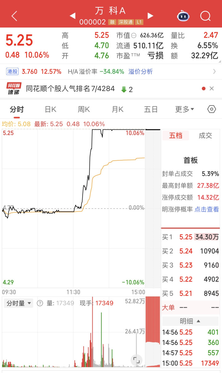 12月10日午后,万科A突然直线拉升并强势封涨停,盘中最高封单金额达27.38亿元,涨停板成交额达14.32亿元。港股方面,万科企业同步大幅走高,盘中一度涨近19%。